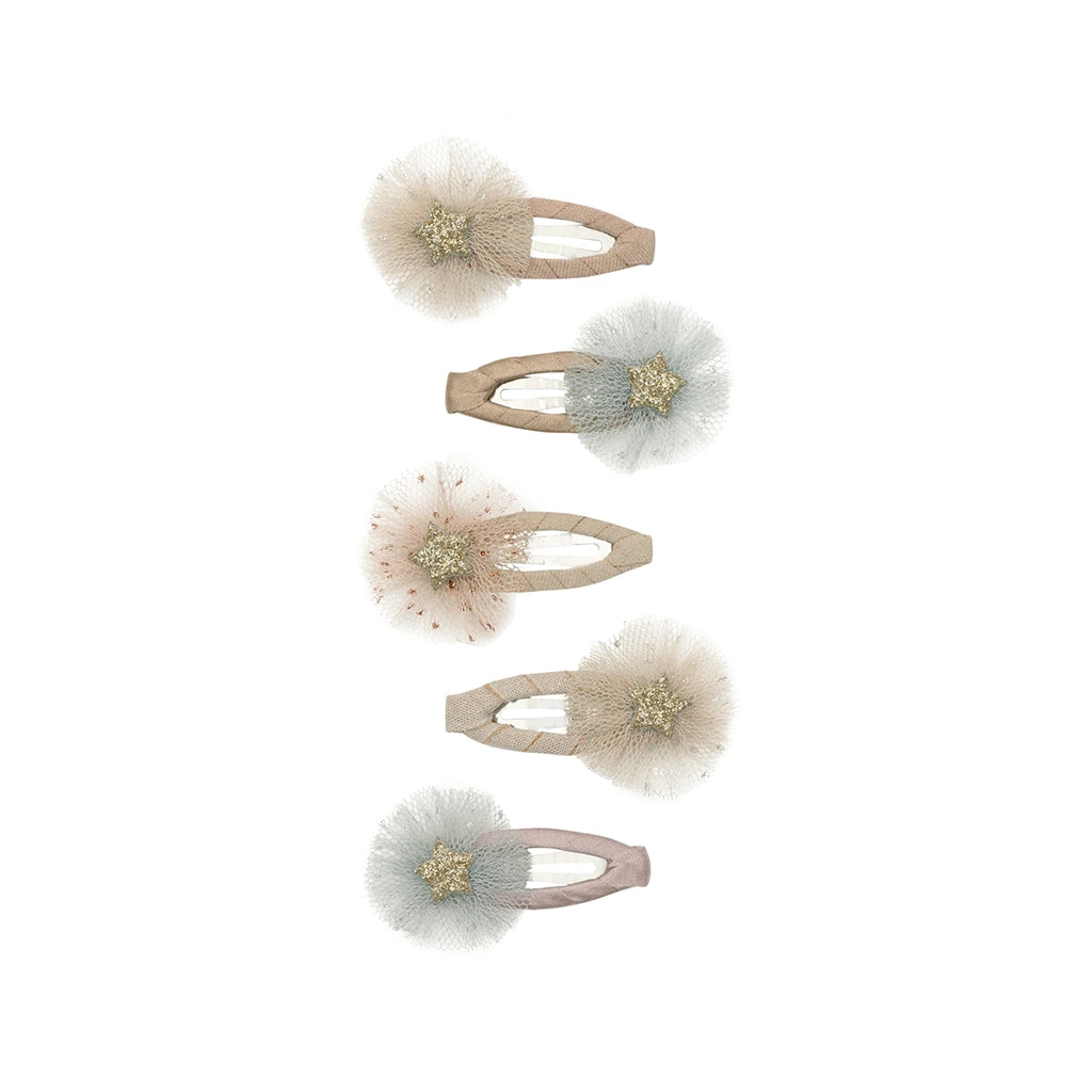• 4cm ribbon wrapped clic clac clips featuring gold glitter star centers, layered over soft tulle rosettes flecked with sparkle