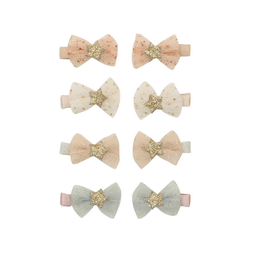 • 3cm ribbon-wrapped mini alligator clips featuring gold glitter padded star centers, layered over soft tulle bows flecked with sparkle