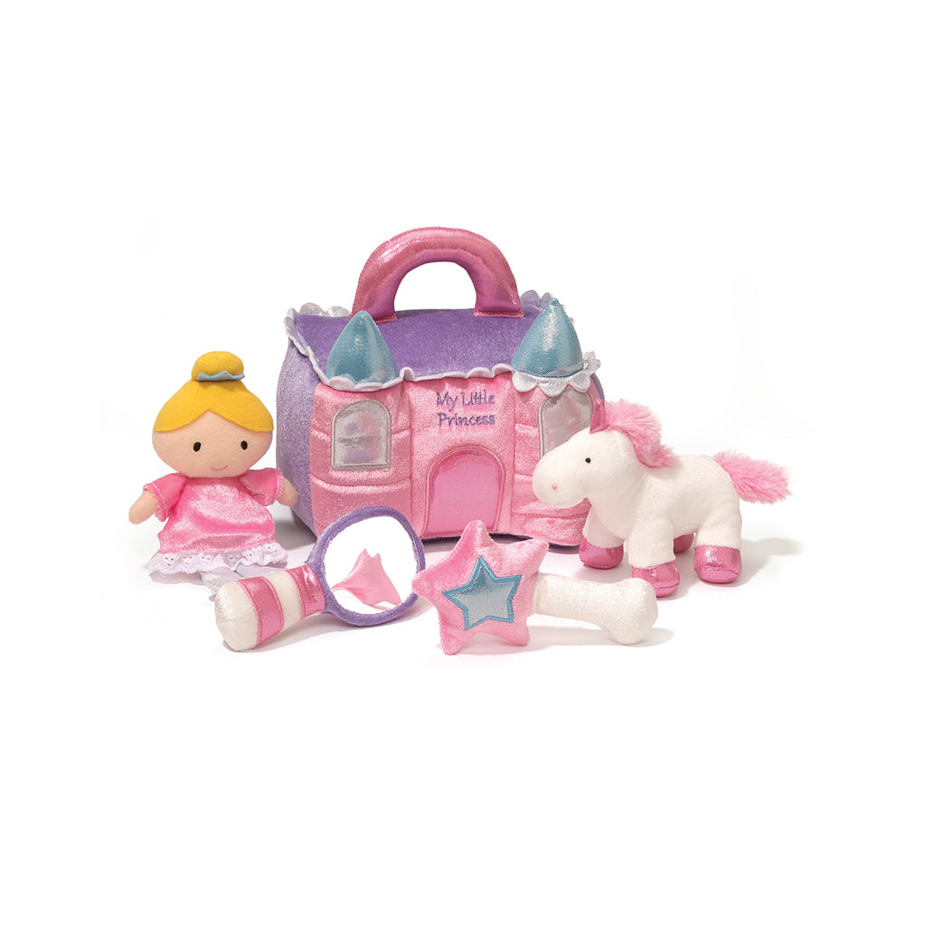 Let little ones live out their royal dreams with the My Little Princess Playset! This playset features a soft pink castle bag that stores 4 soft sensory toys, secured by a touch-and-close fastener: a magical squeaking wand, a unicorn sound toy, a magic mirror rattle, and a princess doll that delivers a satisfying crinkle when squeezed. Each is designed to stimulate and entertain baby!
