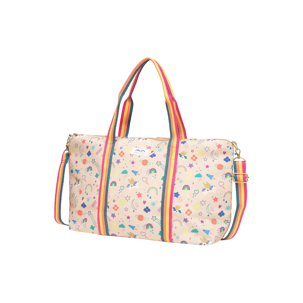 The perfect sleepover bag is back! A sweet and spacious holdall in a super pretty 'Dreamland' printed fabric featuring flying unicorns, rainbows, planets and more!