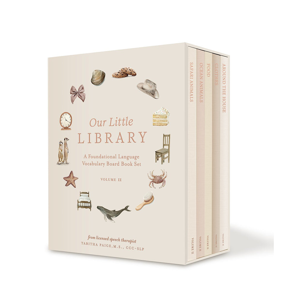 Designed by a professional watercolor artist and licensed speech therapist, Our Little Library Vol. 2 includes five new board books that feature charming watercolor illustrations and foundational first words that will help you build your child's vocabulary. The durable materials and small book size also make them perfect for your baby's little hands.