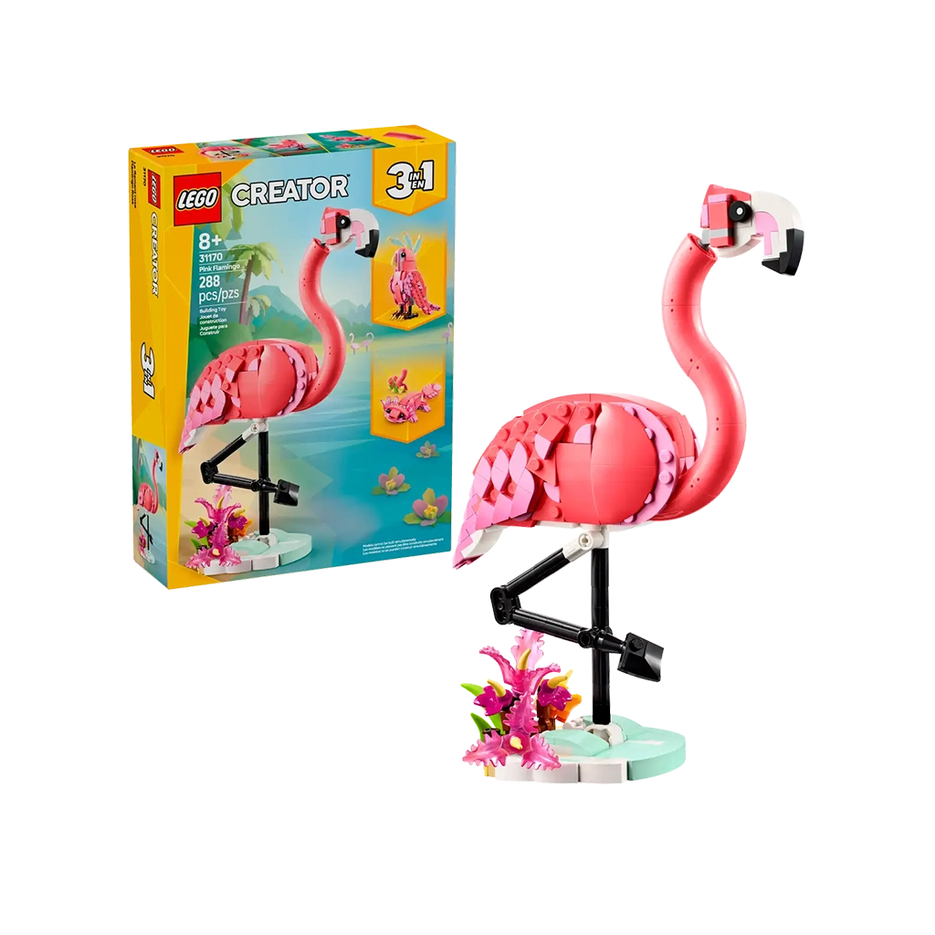 This LEGO set gives kids 3 different building options using the same bricks: a pink flamingo toy with a posable head on a plant-covered stand, a posable pink cockatoo toy, which can rotate its head 360 degrees, or an adorable posable pink axolotl toy with underwater plants. All 3 cute LEGO animal transforming toys make fun gifts for kids.