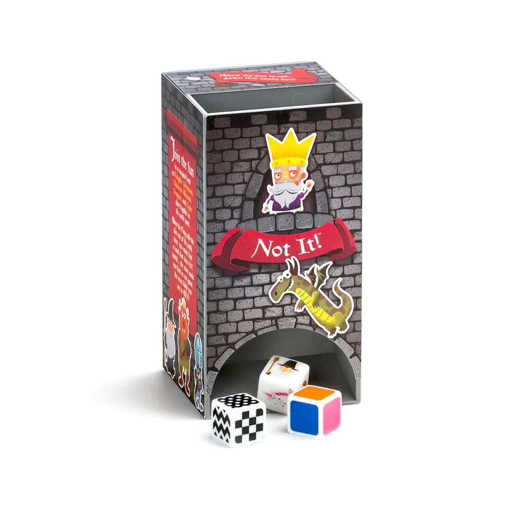 Not It! ™ is fast and frenzied fun for everyone! When the 3 dice tumble from the dice tower, you must find a card in your hand that does not match any of the 3 attributes on each dice!