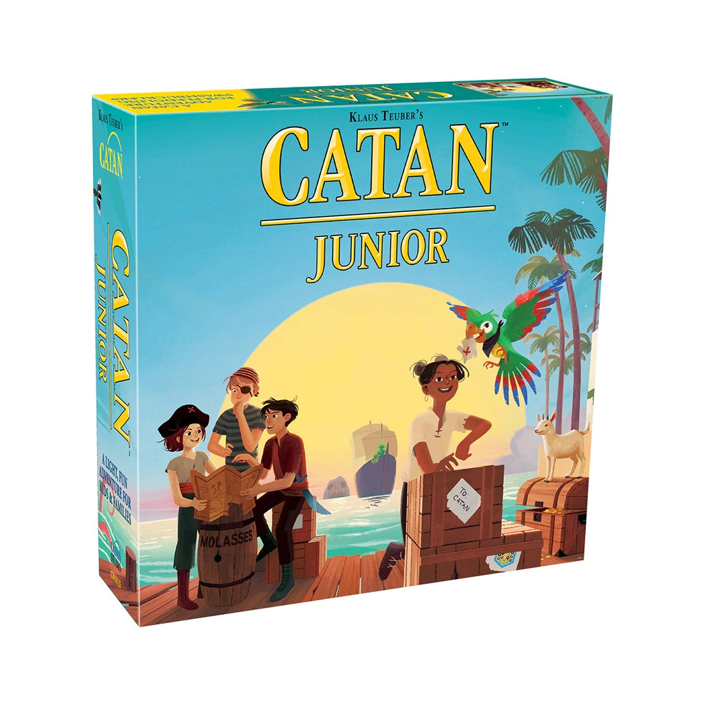Catan: Junior™ lets younger players experience the world of Catan by introducing a simpler playing style. Designed for 2-4 players as young as 6, it is a perfect introduction to the Catan series of games for kids and families. Catan: Junior™ takes place on a ring of tropical isles—including the mysterious Spooky Island, home of the Ghost Captain. Each island generates a specific resource: wood, goats, molasses, or cutlasses. You can also find gold. You start with 2 pirate lairs, and then build ships in order to expand your network. The more lairs you build, the more resources you may receive. Use your resources to build ships, lairs, or to get help from the wise Coco the Parrot. You can even trade in the nearby market. Just watch out for the dreaded Ghost Captain! The first player to control 7 pirate lairs wins the game!
