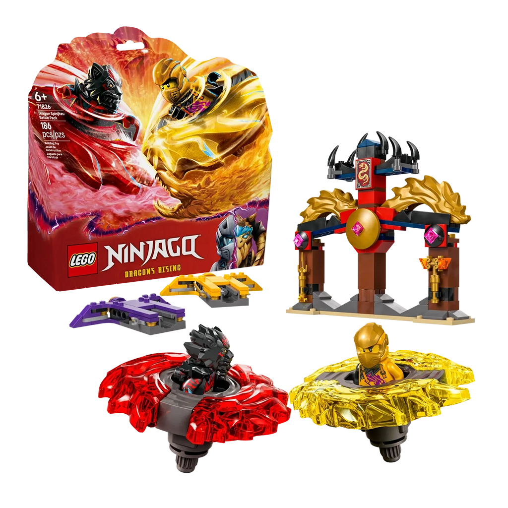 The Dragon Spinjitzu Battle Pack (71826) action toy playset lets boys and girls aged 6 and up play out amazing action from season 3 of the NINJAGO® Dragons Rising TV show. This small LEGO® action toy set features a battle arena temple, 2 minifigures of Arin and Ras and 2 dragon spinjitzu spinner toys for kids to place into launchers and fire into spinning battles against each other.