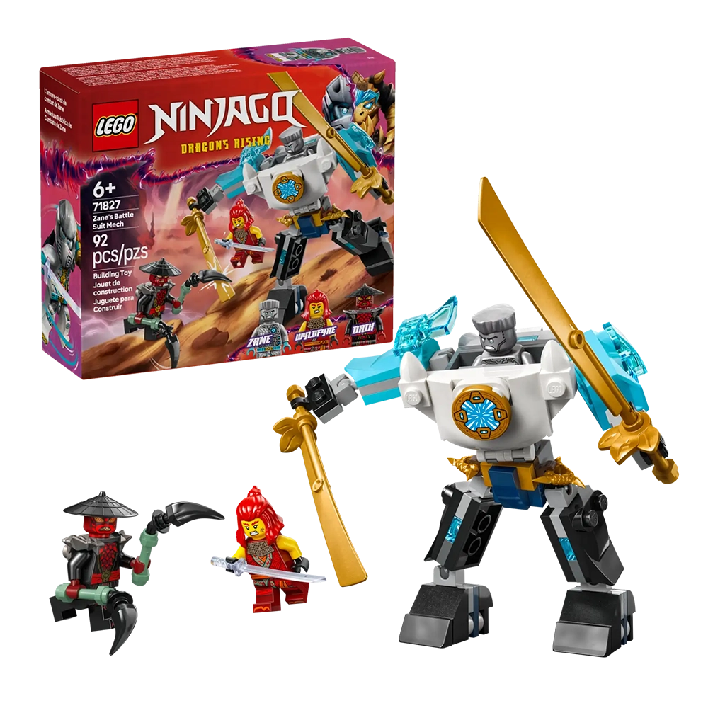 The LEGO® NINJAGO® Zane’s Battle Suit Mech (71827) pretend play toy set lets boys and girls aged 6 and up stage exciting action from season 3 of the NINJAGO Dragons Rising TV show. This building set for kids features a NINJAGO mech with posable arms, legs and hands, an upper body that rotates through 360 degrees, an opening chest to place a minifigure inside and 2 big sword accessories.