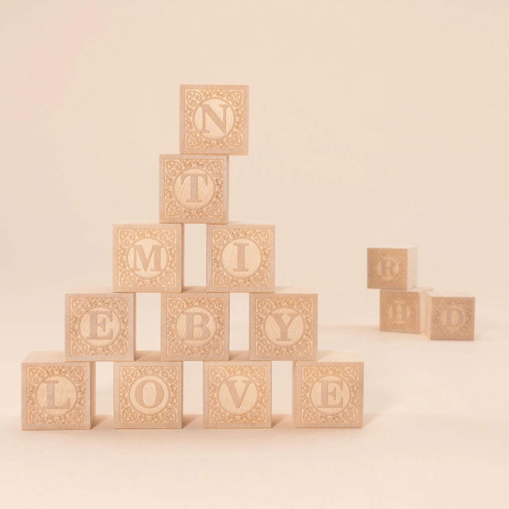 Blank blocks provide a tabula rasa to nurture your creative nature. This set features naked basswood cubes with 2 capital letters embossed on opposing sides. You’ll get one complete alphabet (plus an extra “A” and “E”) to decorate any way you please. Paint not included. Letters on the opposing sides of each block are as follows: A/E, B/P, C/N, D/Q, E/A, F/H, G/Y, I/J, K/L, M/W, O/X, R/S, T/Z, U/V.
