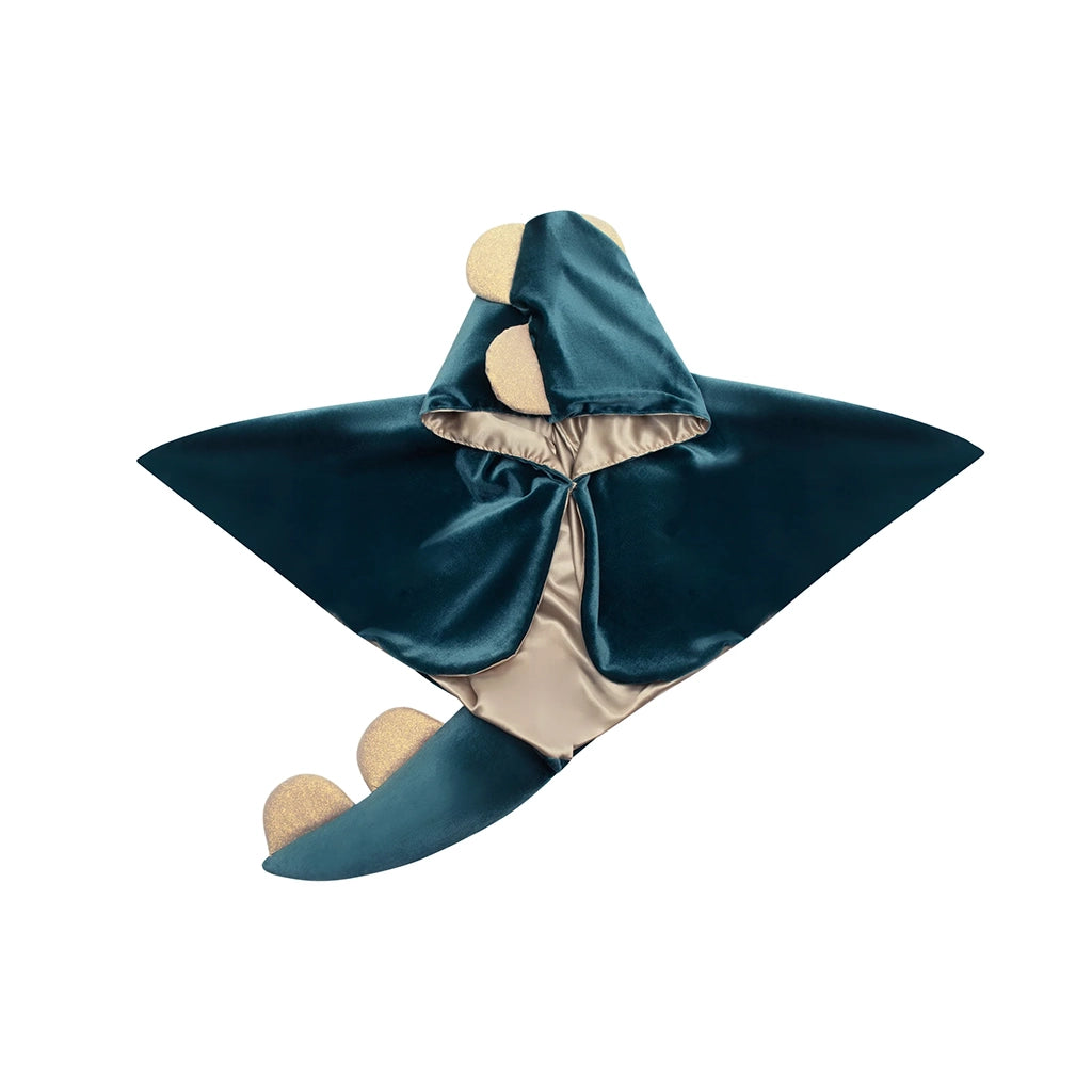 - Crafted from deep green velvet fabric with gold satin lining and gold glitter scalloped 'spines' running from the hood to the tip of the tail