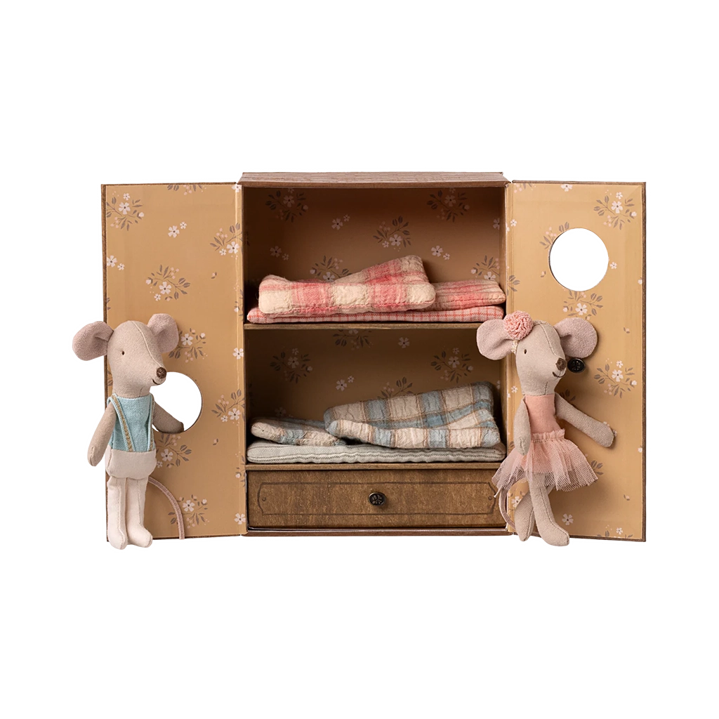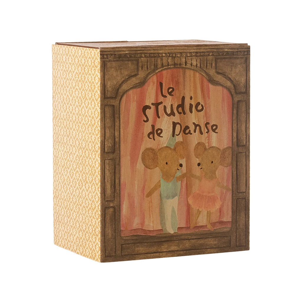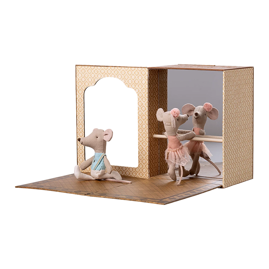 Open the doors of this magical box and explore a world of dance, stardust and storytelling. This set includes a paper box, that is both a dancestudio and a cosy mouse house, as well as two mice dressed for hours of dance in their beautiful clothes.
