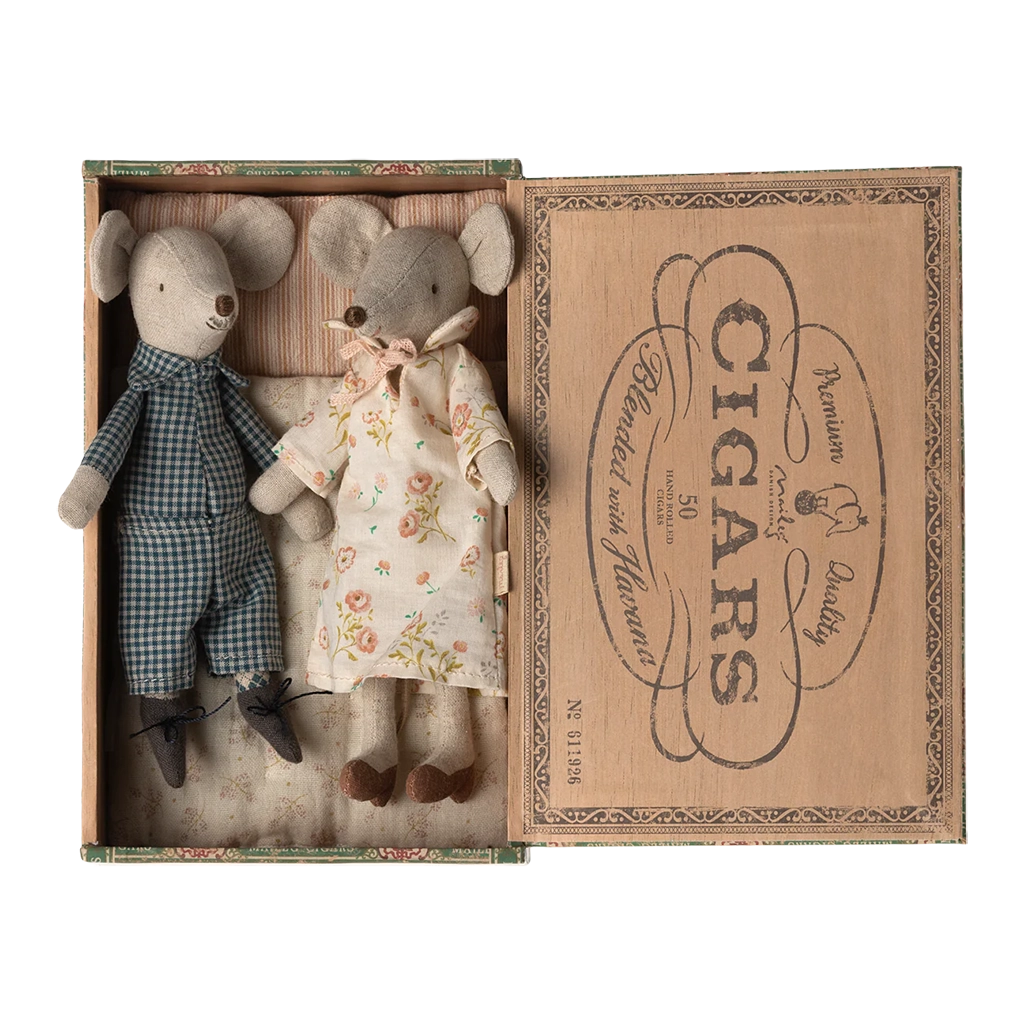 A classic Maileg mouse item. Grandma and grandpa are wearing their nightwear and beautiful shoes. The cigar box is a perfect bed for a good night's sleep. Extend their wardrobe with sets of loose clothes to create a perfect playset.
