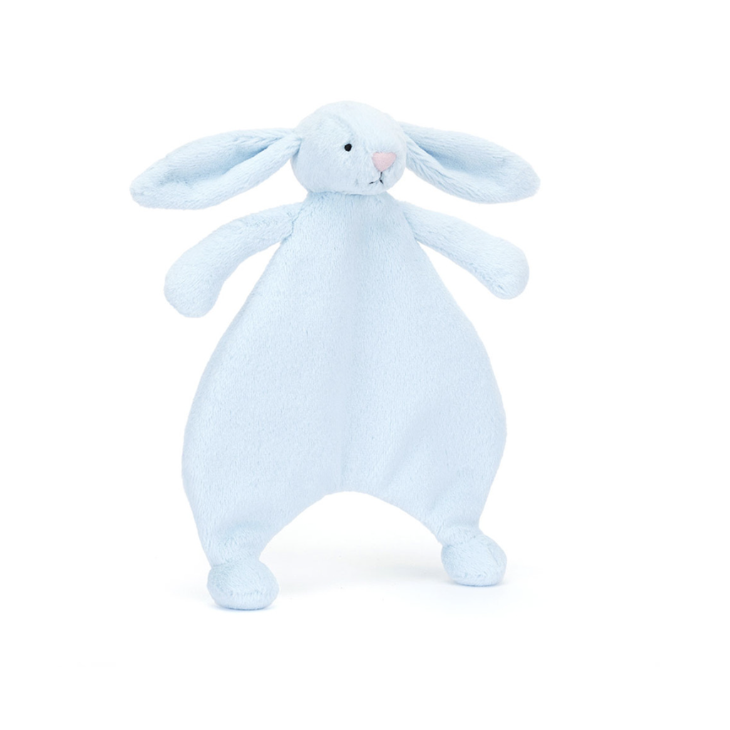 Irresistibly soft in a pale blue coloured fur made from recycled fibres, Bashful Blue Bunny Comforter features the beloved Bashful Bunny signature long lop ears, a pink suedette nose and embroidered eyes. Designed with an un-stuffed body yet delicately squashy paws and bobble feet, making it easy for little hands to grab hold of and comfort themselves.