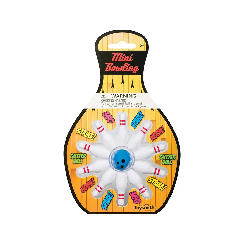 This Mini Bowling game set from Toysmith is finger-sized and easy to play on any flat surface. Comes in a bowling-pin-shaped peggable blister packet with a bowling lane illustration. Easy to display, this top-selling miniature game set includes 10 tiny white and red bowling pins and 1 mini blue bowling bowl. Pins stand 1.5 inches tall. Just set them all up in a triangle, then roll the bowl to start bowling away.