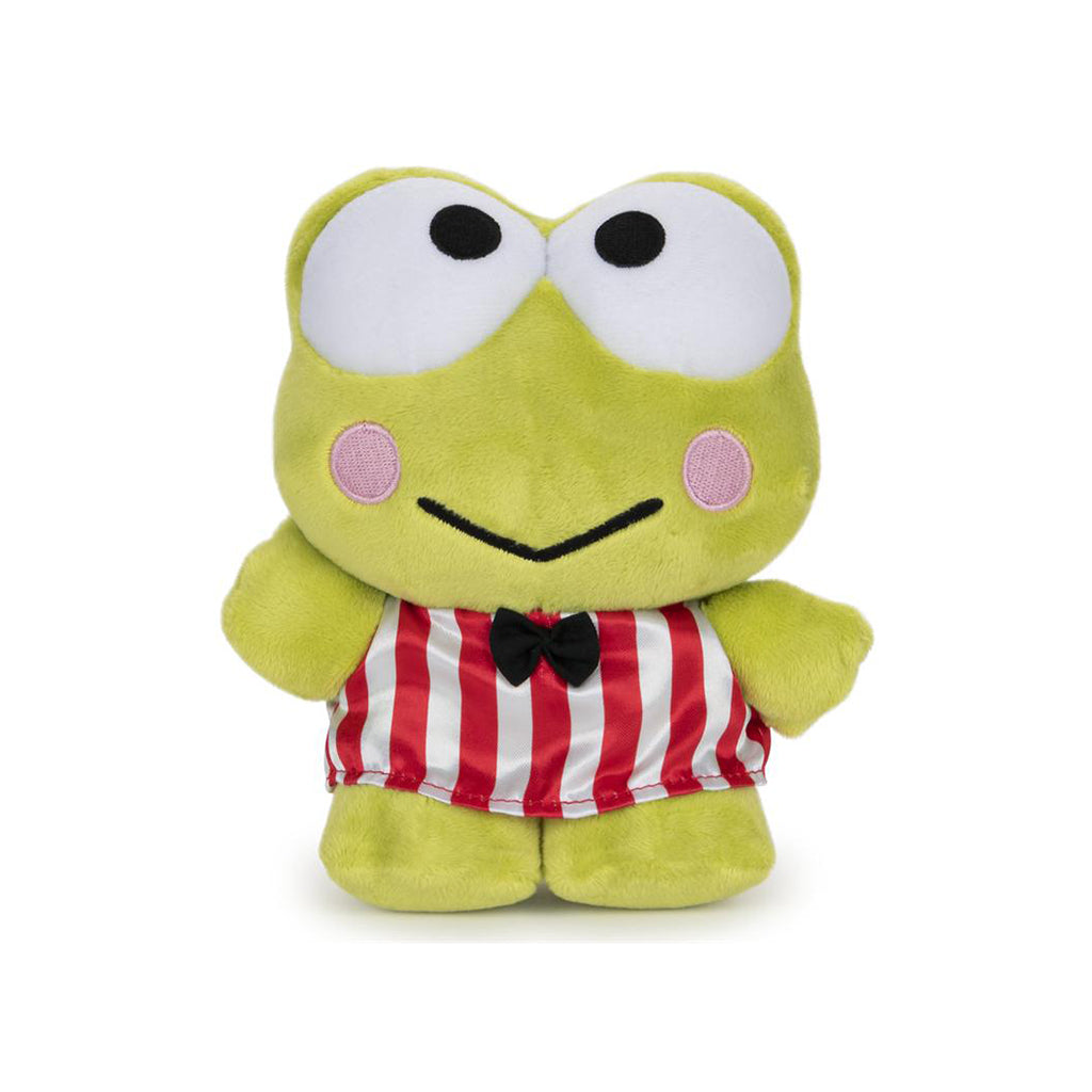 Hello Kitty's friend Keroppi is the happy frog with a v-shaped smile who loves baseball and lives on Donut Pond. This 6-inch plush Keroppi features his classic white and red striped outfit and black bow-tie, rosy cheeks, and a friendly hand up to wave hello!