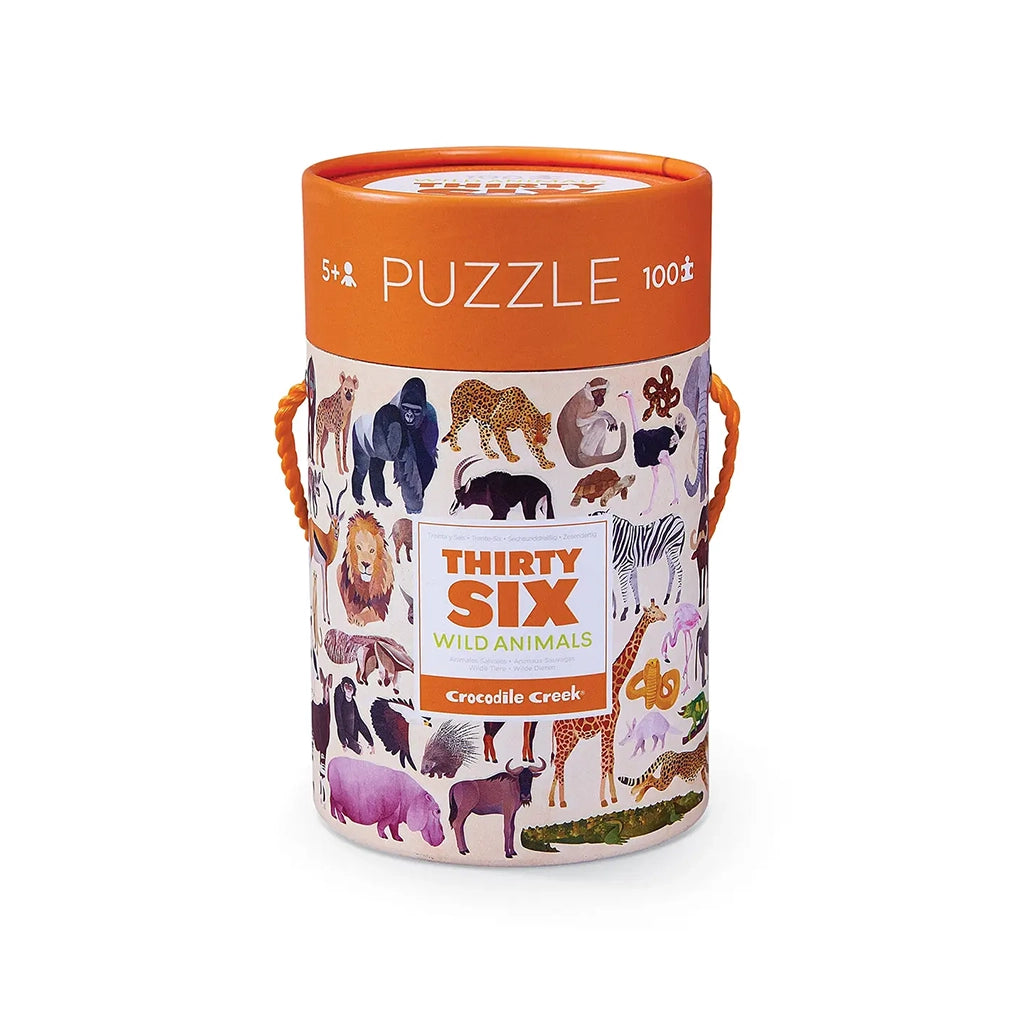 Learn about 36 different wild animals that roam the world in this highlight detailed and challenging 100 piece jigsaw puzzle from Crocodile Creek. Suited perfectly for family fun – and of course for the animal lovers! sturdy canister doubles as storage when not in use. Each puzzle comes with a naming sheet to help you learn about the different wild animals featured.