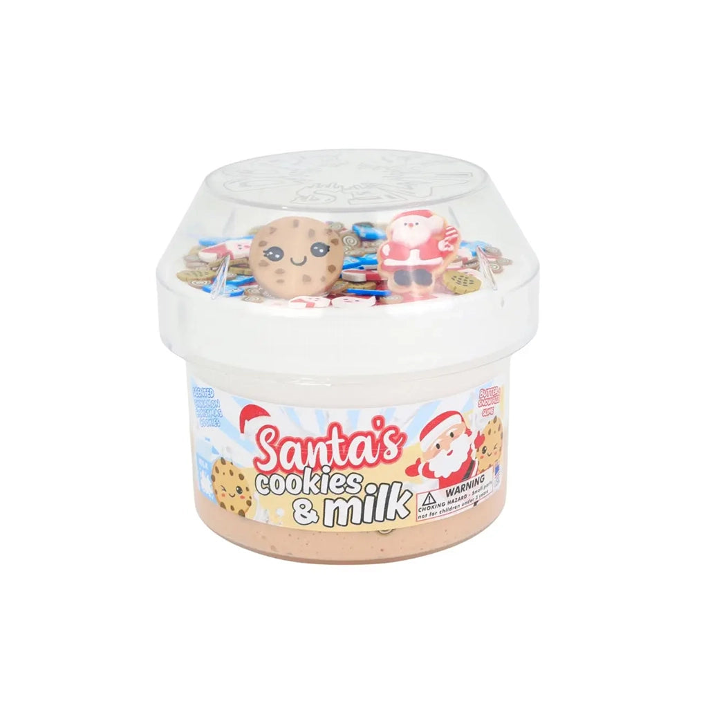 Santa's Cookies & Milk:  Santa's favorite treat turned into a fun, 2 layered Christmas slime! Snow fizz paired with an ultra soft white butter slime which mixes into an ultra sizzly butter fizz slime! The bottom layer is rolled in a themed sprinkle mix then topped with jumbo santa fimos. Scented cinnamon roll & Christmas cookies!