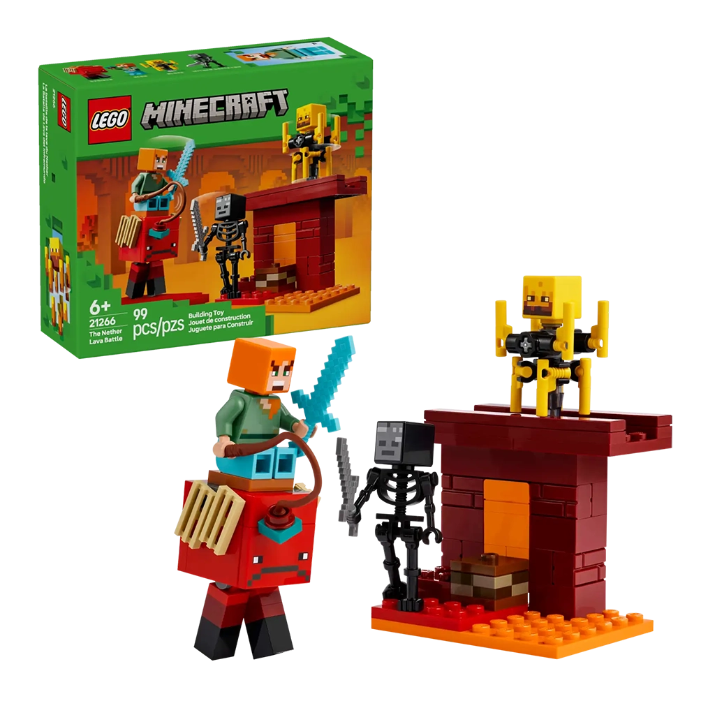 The Nether Lava Battle (21266) is a small LEGO® Minecraft® set that provides a build-and-play version of the popular video game. This versatile Minecraft activity set features popular gaming figures, fun features and endless action, making it the perfect treat for kids aged 6 and up.