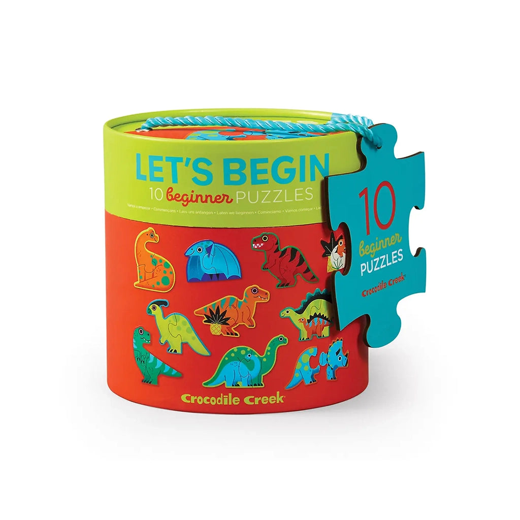 Crocodile Creek Let’s Begin puzzles are perfect for a toddler’s very first learning experience! Each puzzle set is cleverly packaged in a sturdy canister with a rope handle and a puzzle piece on the outside to show puzzle quality on the inside. Little ones love to carry buckets full of goodies and this canister packaging with a handle will certainly delight them. Each package holds ten (10) 2-piece colorful puzzles. Each puzzle, when completed is approximately 4” x 6”. All puzzles pieces have colored edging on front side that will help them complete the puzzle but will also allow them to learn their first colors. If puzzles are flipped on the backside, they can quickly start to match up pieces in a reverse fashion.
