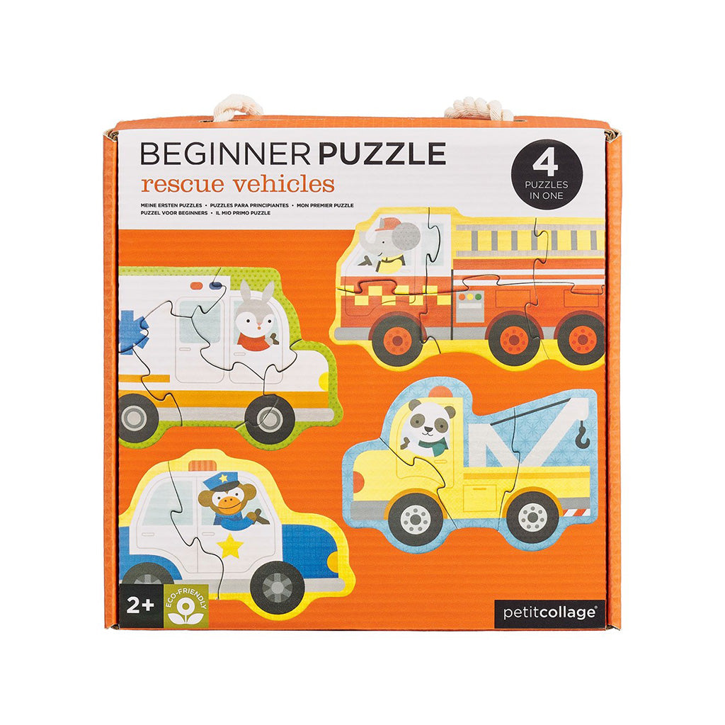 Help little ones develop their puzzle solving skills with this set of 4 Rescue Vehicles Beginner Puzzles from Petit Collage. As toddlers master the 3-piece puzzle, they then progress to the 4-piece, 5-piece, and 6-piece puzzles. Featuring sweet illustrations of animals in rescue vehicles, there are four puzzles included in the set. Made from recycled cardboard and printed with vegetable inks.