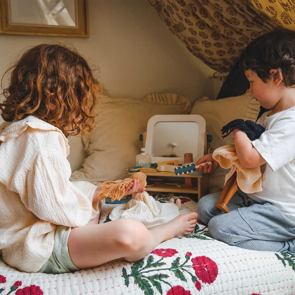 For all hair types, colors and styles, this pretend hair salon offers a full range of hair treatment and styling opportunities. Finished in gender-neutral colors, a tabletop swivel mirror with a storage shelf and a hole for the hair dryer.